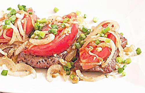 Немножко отбейте бифштексы, посолите, поперчите, натрите чесноком и обжарьте в масле, но так, чтобы внутри они оставались розовыми. Выложите их на блюдо и поставьте на водяную баню. На толстой сковороде потушите 10 минут нарезанный лук и сладкий перец, затем добавьте четвертушки помидоров, потушите еще 5 минут, выложите овощи на бифштексы и подавайте с картофельным пюре и свежей булкой.