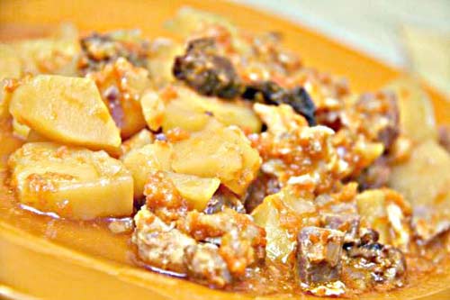 На 200 г баранины — 150 картофеля, 1 луковица, 2 ст. л. томатного соуса, 100 г бульона, 20 г топленого сливочного масла, 5-6 шт. чернослива, лавровый лист, соль, перец – по вкусу.