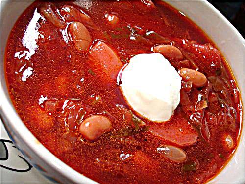 250-300 г фасоли, крутое яйцо, свекла, 5-6 картофелин, белокочанная капуста, примерно 300 г, болгарский перец, пара морковок, 1-2 луковицы, корень петрушки, 1 ст.л. томата-пасты или 2-3 помидора, 3-4 ст.л. раст. масла или 100г шпика, 1 ст. л. сахара, 2 л воды, семя укропа, хмели-сунели, зелень петрушки, укропа. Фасоль перебрать, промыть, замочить часов на 10-12, сварить в этой же воде. Слить фасолевый отвар и в нем варить борщ, как обычно (подробные рецепты борщей см. в прошлом номере Домового). Перед добавлением поджаренного лука и томата добавьте в борщ отваренную фасоль. Часть ее можно потолочь, развести овощным отваром и после этого добавить в борщ. К готовому борщу при подаче добавить зелень, мелко порезанное крутое яйцо.