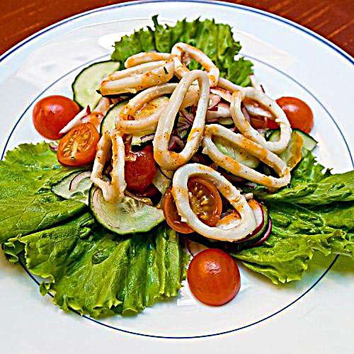 Кальмары, очистив и отварив 3-4 минуты с луком и морковью, солью, горошками черного перца, откиньте на сито – пусть стечет вода, накройте тканью, чтобы не подсохли, остудите и нарежьте пластинами. Нарежьте свежие помидоры, огурцы, зеленый и красный перец, сладкий лук, смешайте с ломтиками кальмара, мелкими головками маринованного лука, добавьте растительное масло, сок лимона, рассол и маринад от овощей, сахар, соль и перец. Салат готов, но поставьте его еще на полчасика в холодильник. Очень вкусно, неожиданно и полезно!