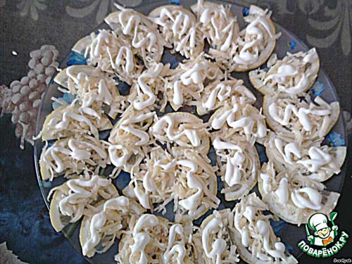 Лимон режем кусочками, на каждый – немного сырной массы (натертый сыр,чеснок, майонез), сверху присыпать гранулированным кофе.