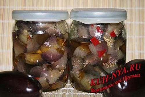 Разрежьте баклажаны пополам, отварите в хорошо посоленной воде, откиньте на дуршлаг. Морковь натрите на терке, мелко порежьте лук и чеснок, помидоры и зелень (зеленый лук, петрушку). Морковь и лук обжарьте на раст. масле, затем хорошо посолите. В банку плотно уложите слоями баклажаны, поджарку, помидоры, пересыпая зеленью и чесноком, немного посолите и поставьте под гнет. Готовы через 3 дня!