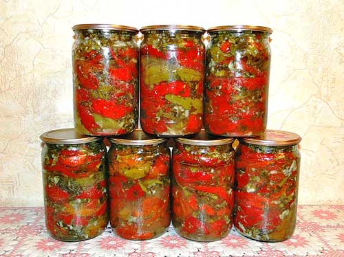 Перец нарежьте кольцами шириной 1?см, яблоки вымойте, вырежьте сердцевину и нарежьте дольками, молодые кабачки или патиссоны нарежьте кружочками. Все эти продукты бланшируйте 3-5 минут в растворе с добавлением меда и яблочного уксуса или сока. Уложите все в трехлитровую банку, раствор доведите до кипения, залейте им банку и сразу же укупорьте ее.