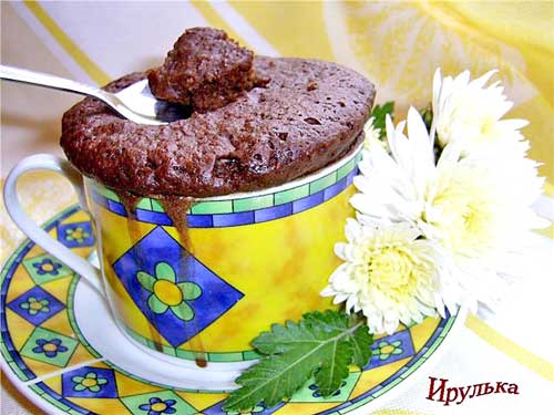 Возьмите полстакана теплого молока, положите 2 ст.л. какао, 3\4 стакана муки, 3 ст.л. сахара и 0,5 ?ч. ложки разрыхлителя. Все смешайте, разлейте в формочки – до половины и поставьте в микроволновку на полную мощность. А подавая, можете положить на каждый кексик шарик мороженого и полить его сгущенкой или вареньем. А можно в тесто добавить изюм, орешки, сухую вишню, кусочки шоколада или немного мака – по желанию. Получается, говорят хозяйки, невероятно вкусно.