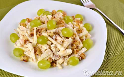 Отваренный корень сельдерея и яблоки нарежьте мелкими ломтикам, перемешайте с с нарезанными ореховыми ядрышками, заправьте майонезом, смешанным с лимонным соком и сметаной. Предварительно поставьте салат на холод. На 100г корня сельдерея – 50г яблок, 40 г грецких орехов, 20 г майонеза, 30г сметаны, 10 г зелени укропа или петрушки, 2 ч.л. лимонного сока, соль по вкусу.