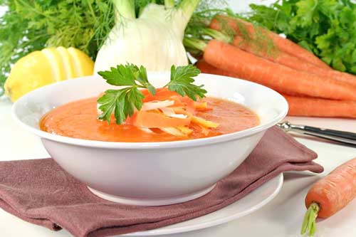 Очень полезен для похудения. На 500 г моркови – 200 г картофеля, 50 мл растительного масла, луковица, 150 г колбасы, зелень петрушки, соль по вкусу. Головку луковицы очистите, порубите, поджарьте до золотистого цвета вместе с кусочками колбасы. Положите морковь, разведите небольшим количеством воды, посолите и тушите до полуготовности. Теперь добавьте картофель и тушите до готовности. Посыпьте суп зеленью петрушки.