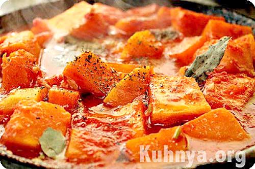 На 0,5 кг мякоти тыквы – 2 ст.л. томатной пасты, 2 - 3 зубчика чеснока, пучок зелени (обязательны укроп, петрушка, базилик, остальное – по вашему вкусу), 3 - 4 помидора, растительное масло, соль, красный молотый перец. Тыкву порежьте кусочками и быстро обжарьте в масле с солью и перцем. Добавьте томатную пасту (или помидоры – по своему вкусу), половину измельченного чеснока, немного нарезанного базилика. Пожарьте минут 5, накройте крышкой и тушите на медленном огне до готовности. Помидоры опустите в кипяток, чтобы легко снять кожицу, мелко порубите и переложите в готовую тыкву. Перемешайте, снимите с огня, посыпьте оставшимся чесноком и зеленью.
