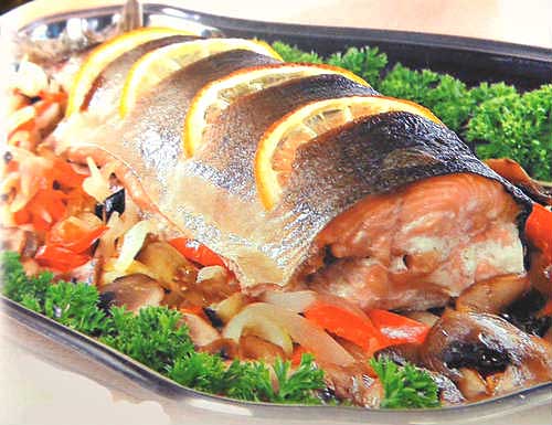 На 0,5 кг рыбы – 150-200 г грибов (например, шампиньонов), 1 луковица, зелень, лимонный сок, раст. масло, белое вино, соль, перец, специи для рыбы и зелень. Рыбу нарежьте на порционные куски, посыпьте специями для рыбы, солью, перцем. Нарежьте грибы, лук порежьте полукольцами. Лук и грибы обжарьте на раст. масле и немного потушите. На лист фольги уложите по 1 ст.л. грибов и лука с зеленью, затем положите кусочек рыбы, сбрызните лимонным соком. Заверните фольгу, чтобы сок не вытекал, и запекайте в духовке до готовности (минут 20 при 200гр.). Рыбу, вынув из фольги, подавайте на стол с шампиньонами и луком.