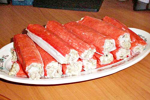 Точнее, конечно, из крабовых палочек. На 6-7 крабовых палочек – 3-4 плавленых сырка и 3-4 зубчика чеснока. Сырок и чеснок натрите на мелкой терке и заверните рулетиком в крабовые палочки. Приноровиться можно быстро, а получается вкусно и красиво.