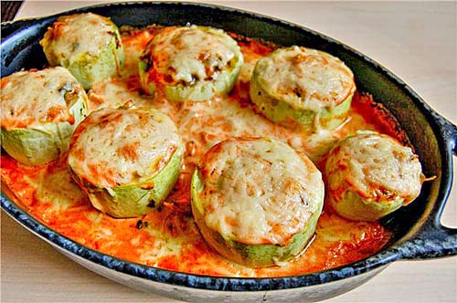 2 крупных кабачка, 500 г мясного фарша, 1 яйцо, 1 луковица, 5 ст.ложек риса, 100г сыра, 2 зубчика чеснока, соль. Кабачки нарежьте на куски длиной 5-7см, семена удалите и варите минут пять в подсоленной воде. Отварите рис. В фарш добавьте нарезанный лук, рис, сырое яйцо, соль. Начините кабачки этим фаршем. И запекайте их на противне 20 минут при 200 градусах. Приготовьте соус из тертого сыра, измельченных помидоров, чеснока и майонеза. Выньте кабачки из духовки, залейте соусом и запекайте еще 20 минут. Теперь эту вкуснятину можно подавать.