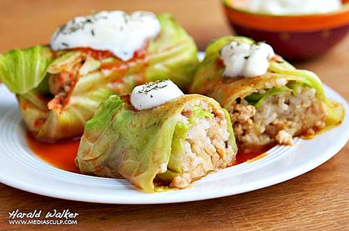 На 1 кочан капусты: 200 мл молока, 1 литр воды, 2 ст.л. сливочного масла для жарки. Для начинки: 500 г грибов, 1 луковица, 4 ст.л. вареной гречки, 2 крутых яйца, 2 ст.л. майонеза, соль, перец, зелень – по вкусу, 1 ст.л. сливочного масла. Для соуса: 150 мл сметаны, 2 ст. л майонеза, 200 мл грибного бульона. Соль, перец, зелень – по вкусу. Прежде всего варите в молоке с водой кочан, выложите его на дуршлаг, остудите, надрежьте листья у основания и отделите их. Если они отделяются плохо, немного доварите. Для начинки сначала обжарьте мелко нарезанный лук, грибы отварите в подсоленной воде и нарежьте. Соедините вместе грибы с луком и жарьте еще 10 минут. Добавьте рубленые крутые яйца, гречневую кашу, майонез, измельченную зелень. Перемешайте, посолите-поперчите по вкусу. На листья капусты выложите начинку. Сверните конвертиком и быстро обжарьте голубцы с двух сторон на сливочном масле. Осталось приготовить соус, все соединить и перемешать. Выложите голубцы в кастрюлю или форму плотно друг к другу, залейте сначала водой до половины, затем соусом и тушите 20 минут, подливая, если нужно, воды. Украсьте это вкусное блюдо по своему вкусу и фантазии.