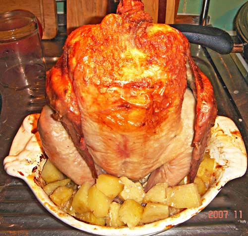 1 средняя курочка, 5 картофелин, парочка помидоров, 150 г майонеза, соль, перец, специи – по вкусу. Соедините майонез со специями и перемешайте. Несколько ложек этой смеси оставьте для картошки, а остальной обмажьте курочку, дайте ее хорошо пропитаться – минут 15-20. Почистите картошечку, крупно нарежьте ее. А помидоры нарежьте дольками. В центре сковороды или противня поставьте поллитровую бутылку с водой. «Усадите» на нее курочку. Вокруг выложите картофель, посолите, поперчите, полейте майонезом. Сверху выложите помидоры. Запекайте в духовке минут 35-40) при Т – 180 градусов.