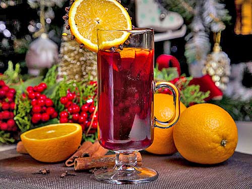 На 1 литр сухого или полусухого красного вина – 1,5 ст.л. сахара, сок половины лимона, 4-5 бутончиков сухой гвоздики, мускатный орех, корица – на кончике ножа, 1 стакан воды. Фрукты вымойте, нарежьте, воду доведите до 50 гр. и всыпьте в него специи. Помешивая, подогрейте воду до 70 градусов и, уменьшив огонь, влейте вино. Размешав, добавьте сахар, а еще лучше – мед. Затем опустите в него дольки апельсина и потомив минут 10, снимите с огня, настойте под крышкой минут 15 и разлейте в украшенные кусочками лимона и яблок бокалы.