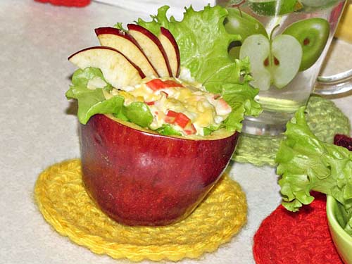 Возьмите 5-8 крупных красных яблок, 1 болгарский перец, пучок зеленого лука, крутое яйцо, банку зеленого горошка, майонез, соль, черный перец. Яблоки разрежьте поперек пополам, выньте немного мякоти, порубите ее и смешайте с зеленым горошком, крутыми яйцами, рубленым луком. Этим салатом наполните яблочные половинки, украсьте кольцами перца, подавайте на плоском блюде. Неожиданно и оригинально!