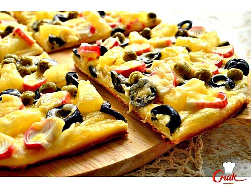 Раскатайте пласт слоеного бездрожжевого теста смажьте его майонезом, порезанные кусочки ананаса и крабовых палочек равномерно распределить по поверхности теста, выложить маслины, добавьте зеленый горошек, присыпьте поверхность пиццы натертым на мелкой терке сыром твердых сортов. Выпекать около 25 минут при 200 градусов. Немного охладить пиццу перед подачей на стол.