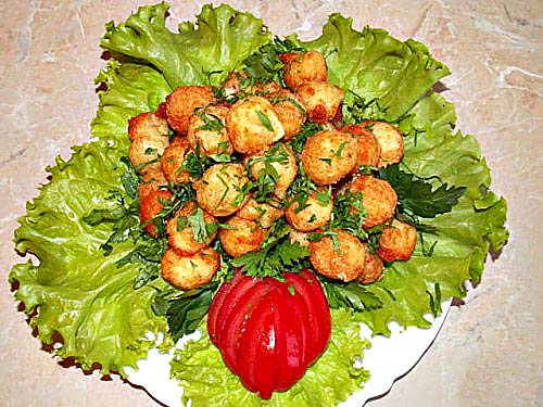 На 200 г крабовых палочек 160 г сыра, 1 яйцо,3-4 ст.л. майонеза, соль, перец, горчица, раст. масло по вкусу, мука для панировки.