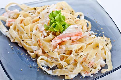 Крабовые палочки — 200 г, спагетти – 350 г,соль 1 ст. л., 1 перец красный жгучий, 2 зубчика чеснока, половинка лимона, 100г оливкового или другого – по вашему вкусу – масла.