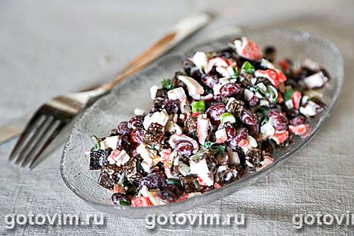 Лук мелко порежьте и спассеруйте. Нарежьте крабовые палочки колечками. Из фасоли вылейте жидкость, сыр натрите на крупной терке, яйцо – на мелкой, зелень измельчите. Высыпьте все в глубокую тарелку, добавьте майонез, соевый соус и специи, хорошо перемешайте, добавьте листья салата. Готово! Можно подавать в салатнице, можно сделать тарталетки.