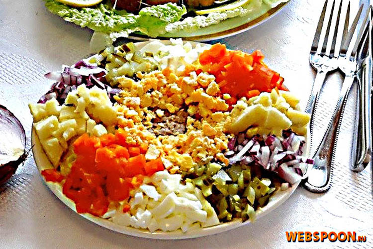 Салат для праздничного стола, очень сытный и калорийный. Печень трески – 1 банка, 3 крутых яйца, 1 солёный огурец, половинка луковицы (желательно фиолетовой), 1 картофелина, 2 моркови, щепотка черного молотого перца.