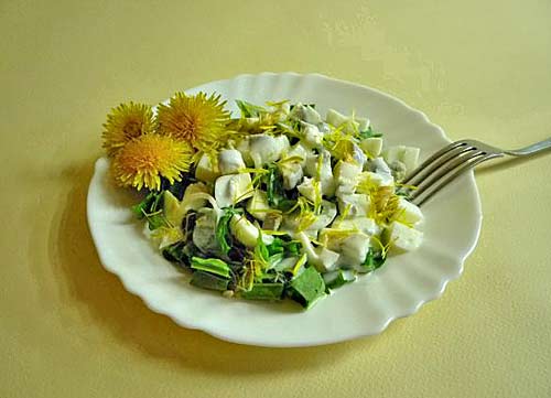 Если, конечно, вы найдете одуванчики!) 400 г листьев одуванчика, 200 г зеленого лука, зелень петрушки, укропа, 2 ст. л. раст. масла, 1 ст. л. лимонного смока или уксуса, соль. Листья одуванчика промойте и положите на полчасика в холодную воду, затем откиньте на дуршлаг, чтобы вода стекла и порежьте лук. Добавьте измельченную зелень петрушки и лук, заправьте маслом, солью, уксусом, перемешайте, посыпьте укропом.