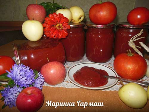 5 кг помидоров, 1 кг яблок, по 300 г болгарского перца, чеснока и помидоров, 1-3 стручка горького перца, соль по вкусу.