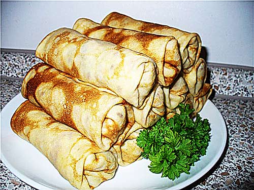 Протираем через сито 300 г творога. Промываем и мелко нарезаем 200 г черемши и смешиваем ее с творогом. Берем блинчики и заворачиваем в них вкусную начинку. В качестве заключительного этапа обжариваем блинчики на масле.