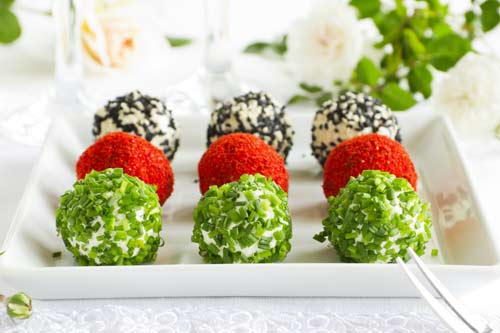 Моцареллу или брынзу натрите на крупной терке, смешайте со сливочным сыром и хреном, приправьте соусом. Из сырной массы слепите несколько шариков величиной с крупную вишню. Одну треть шариков обваляйте в фисташках, другую – в петрушке. Оставшиеся шарики поместите между разрезанными пополам ягодами винограда и слегка прижмите. Можно заменить обсыпку по вашему усмотрению – например, кунжутом (его лучше чуть-чуть обжарить), или укропом, или даже кокосовой стружкой. Экспериментируйте! Красиво выложите в салатник.
