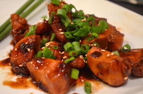 Курица как курица, то есть обыкновенная. Всё дело – в соусе. Возьмите 1 ст. л. соевого соуса, 1 ст. л. горчицы, 1 ст. л. уксуса, 1 ст. л. мёда. Курицу разрежьте на кусочки или распластайте, обмажьте соусом с двух сторон и положите в сковороду, смазанную жиром. И всё, осталось запечь в духовке!
