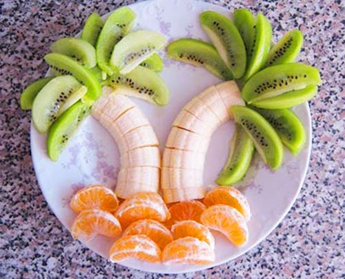 Возьмите красивую тарелку и выложите по краям дольки мандарина или апельсина, и будет это – песок, а из разрезанного вдоль и поперек банана – «ствол пальмы». Нарежьте полукружочками очищенный от шкурки киви (или наш кишмиш), выложите эти зеленые ломтики сверху в виде кроны, будто «выросла»… пальма.