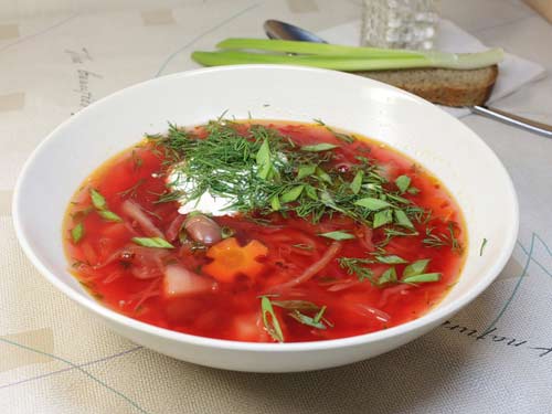 Вариантов даже самого обычного постного борща – масса, всё зависит от вашего вкуса. Половинку свёклы нарежьте соломкой, залейте водой и поставьте на огонь, варите примерно 30-35 минут, пока свекла не потеряет красный цвет. Во время варки добавляйте специи: перец черный и душистый, гвоздику, чабрец, базилик, соль. Порежьте соломкой оставшуюся половинку свёклы и морковь, обжарьте их на растительном масле, добавляя при жарке мелко порезанную луковицу и чеснок. Когда зажарка подрумянится, добавьте помидоры или томат-пасту, можно и кетчуп. Пасту разведите жидкостью из кастрюли. А зажарку после добавления томатов держите на слабом огне минут 15-20, затем добавьте в кастрюлю ломтики картофеля, а через 20 минут – помидоры, доведите до кипения, через 3-4 минуты положите нарезанную зелень (укроп, петрушку, кинзу – по вкусу).