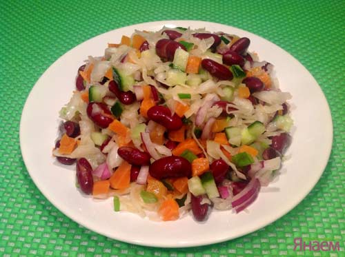 400 г квашеной капусты, 3/4 ст. отварной фасоли, 1/2 селедки, 3 ст. л. растительного масла, 1/4 луковицы, зелень, специи.