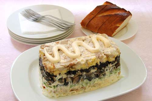 Хорошенько промойте мясо, залейте его горячей водой, добавьте по вкусу соль и специи, варите примерно полчаса, пока не станет мягким, остудите, нарежьте кусочками. Чернослив промойте, залейте кипятком примерно на 20 минут, воду слейте и нарежьте его полосками. Грибы очистите от пленок, промойте, нарежьте тонкими пластинками, нашинкуйте лук и вместе обжарьте их до мягкости. Измельчите на терке кусочек твердого сыра. На блюдо разложите кусочки мяса и промажьте майонезом (говорят, что вкуснее всего домашний майонез). Затем выложите на блюдо обжаренные с луком грибы, на них – кусочки чернослива, промажьте немного соусом, посыпьте сыром и ядрышками грецких орехов.