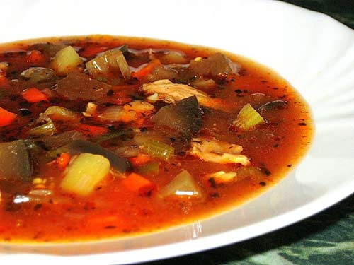 Баклажаны средней величины нарежьте ломтиками и обжарьте в сливочном масле, обваляв в муке. Обжарьте мелко нарезанные морковь, корень пастернака, луковицу и стручок болгарского перца. В кипяток бросьте нарезанный картофель, затем, когда он наполовину сварится, добавьте обжаренные овощи, всыпьте манку и варите на малом огне до готовности.