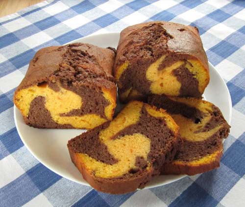 Яйца взбейте с сахаром, добавьте сок и масло, пюре и муку с разрыхлителем, перемешайте. Тесто разделите на 2 части, в одну добавьте растопленный шоколад. Форму для теста смажьте маслом и выложите ложкой поочередно разное тесто. Поставьте форму в нагретую до 180 градусов духовку на 45 минут. Готовый кекс немного остудите, выньте из формы и нарежьте кусочками.