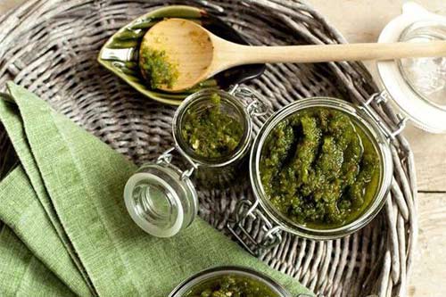 На 500 г кабачков: 80 мл растительного масла, 50 г лука, 1-5 небольших зубчиков чеснока, 50 г толченых грецких орехов, петрушка, укроп, маслины, соль, можно добавить немного винного уксуса.