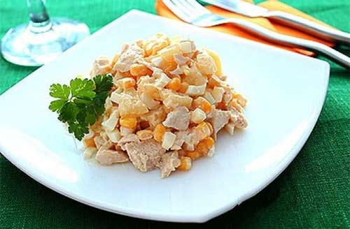 Отварите в соленой воде со специями куриное филе, сварите яйца вкрутую, как всё остынет – нарежьте кубиками. Выложите в большую миску кукурузу, затем добавьте нарезанное филе и яйца, заправьте майонезом, досолите, перемешайте, выложите на красивое блюдо, украсьте зеленью. Готово быстро, вкусно и красиво!