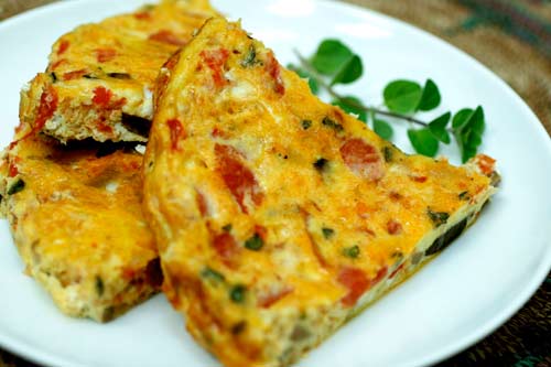 Омлет можно приготовить на сковороде или запечь. Форму для запекания смажьте маслом, вылейте в нее взбитые со сливками, солью и пряностями яйца. Выложите нарезанные помидоры, натертый на крупной терке сыр и измельченную ветчину или кусочки колбасы, посыпьте рубленой зеленью, жарьте или запекайте 15-20 минут в духовке, разогретой до 220 градусов.