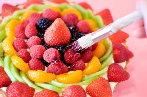 Подберите, вымойте и обсушите самые яркие ягоды на свой вкус (сливу отделите от косточек, виноград выбирайте без косточек и т.д.), нарежьте красивыми ломтиками фрукты (спелые бананы, красивые яблоки и груши). Кисточкой смажьте ягоды жидким сахарным сиропом и обваляйте их со всех сторон в сахаре, насыпав его на блюдце. Застелите красивой салфеткой или бумагой (типа пергамента) с вырезанным узорным рисунком плоскую большую тарелку или блюдо и выложите на нём всё это. Крупные ягоды и фруктовые ломтики можно нанизать на шпажки или соломинки и дополнительно украсить ими мороженое, прохладный напиток или легкий коктейль.