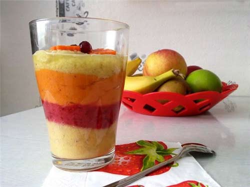Бананы лучше всего берите слегка переспевшие, очистите их, нарежьте кусочками и взбейте в миксере с небольшим количеством молока до однородной массы. Мандарины очистите от шкурки и косточек и взбейте отдельно. Яблоки очистите и взбейте с небольшим количеством молока (до состояния пюре). Возьмите большой широкий бокал (или красивый стакан) и создайте десерт слоями: сначала выложите в него часть бананового пюре, разровняйте, затем – яблочное, потом – мандариновое и снова – банановое. Каждый слой лучше немножко утрамбовать, чтобы сбоку они выглядели ровно и красиво.