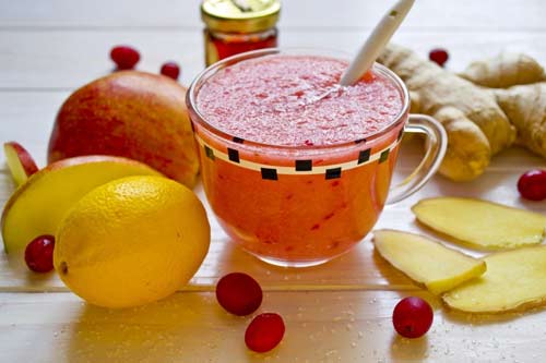 1 грейпфрут, 1 киви, 1 яблоко, 1 банан, небольшой корень имбиря, 20 г мёда.