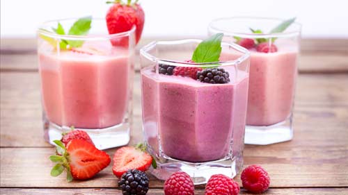 На 300 г свежих или замороженных ягод (малина, ежевика, клубника, кишмиш и др.): 1-1,5 ст. л. сахара, 1 стаканчик мороженого (шоколадный пломбир или сливочный), молоко – по вкусу.