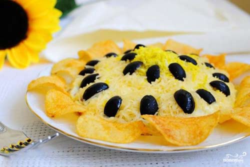 Куриное филе нарежьте небольшими кусочками и обжарьте на растительном масле, посолите. Готовое филе измельчите. Морковь промойте и отварите вместе с яйцами. Яйца выберите раньше, затем морковь. Отваренную морковь очистите от кожицы и нарежьте небольшими кубиками или натрите на средней терке. Яйца измельчите или также натрите на терке. Грибы измельчите. Лук очистите и нарежьте мелкими кубиками. Приготовьте большое сервировочное блюдо. Салат «Подсолнух» с кукурузой нужно вкладывать слоями, каждый слой перемазывая майонезом: на дно – курицу, затем – морковь, грибы, яйца, лук, кукуруза. А теперь сделайте подсолнух: выложите черные семечки – разрезанные вдоль маслины, а по кругу воткните в нижний слой салата чипсы в виде лепестков. Можно посадить на наш подсолнух и божью коровку из половинки помидорки черри с точками из майонеза.