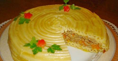 Отварите макароны в подсоленной воде, слейте воду, промойте и выложите на полотенце, чтоб подсохли и приобрели липкость. Помидоры обдайте кипятком, очистите от кожицы и измельчите. Мелко порежьте лук и грибы, смешайте с фаршем. Туда же добавьте помидоры, яйцо, соль и перец. Фарш хорошо вымесите. Форму обильно смажьте сливочным маслом и с серединки на дно выложите макароны спиралькой. Заполните макаронами всю форму. Положите в форму начинку, примните ее. Сверху сделайте также спиралькой «крышечку» из макарон. Сверху пирог закройте смазанной маслом бумагой для выпечки. Поставьте пирог в разогретую до 200 градусов духовку на 90 минут. По готовности выньте пирог, дайте немного остыть и переверните на блюдо.