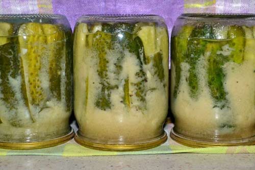 На 1 кг мелких огурцов: 3 луковицы, пучок укропа, 1/4 ст. л. уксуса, 2 ст. л. сухой горчицы, 5 ст. л. сахара, 1 лавровый лист, 1 ч. л. перца.