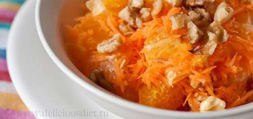Натрите на мелкой терке морковь, мелко порежьте очищенные апельсины, хорошо перемешайте и заправьте измельченными орехами.