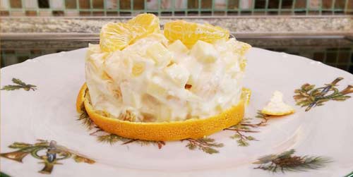 Сыр нарежьте кубиками, подавите чеснок и смешайте с большей частью майонеза. Дольки мандаринов нарежьте на 2-3 части, сложите в миску, добавьте оставшийся майонез и перемешайте. Подавайте в отдельных формочках или на формованном блюде.
