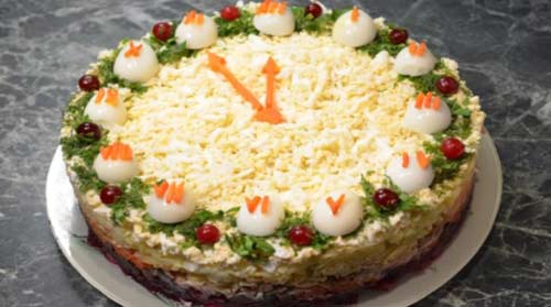 Лук нарежьте полукольцами, в уксус добавьте сахар, перемешайте и залейте лук минут на 5, затем выньте его и отожмите. Картофель натрите на крупной терке, сыр – на мелкой, филе сельди нарежьте кусочками, огурцы нарежьте мелкими кубиками. Все продукты выложите слоями: сельдь, лук, свёкла, майонез, мелкие кубики огурцов, тертая морковь, слой майонеза, слой тертых яблок, сыр, картофель, майонез, сверху посыпьте тертыми яйцами, украсьте зеленью. Из моркови можно вырезать цифры и стрелки, разрезанными яйцами или ягодами – в виде циферблата. Всё! Главное в этом салате – выдумка! И получится вкуснятина.