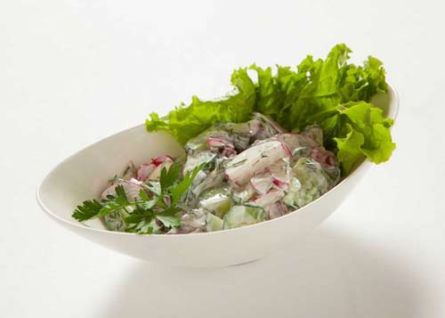 Всё делается очень просто, как обычный винегрет: картофель, лук, свёкла, только капуста в этом салате – морская, а не обычная белокочанная, и посыпать его сверху (хоть чуть-чуть) желательно красной икрой.