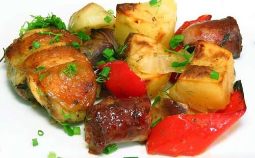 700 г картофеля, 1/2 кг курицы (лучше всего бедрышки), 400 г колбасок для жарки, 2 болгарских перца, 2 луковицы, 40 г растительного масла, соль, черный молотый перец, зелень – по вкусу. Пряности: по 1 ч. л. сушеных базилика и петрушки, по 1/2 ч. л. майорана и паприки, 1 веточка розмарина, 1/4 ч. л. кайенского перца.