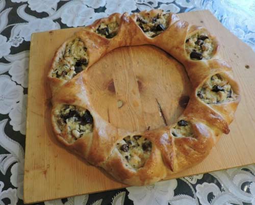 Куриное мясо нарежьте на маленькие кусочки и обжарьте до готовности. Мелко нашинкуйте лук, обжарьте на растительном масле, добавьте грибы и обжарьте до готовности. Переложите всё в другую посуду добавьте измельченный плавленый сыр и натертый на терке твердый сыр, перемешайте. В эту готовую начинку можно добавить грецкие орехи и подать к столу в виде салата. Поставьте тесто в хлебопечку. Готовое тесто разделите на две равные части. Одну часть теста раскатайте и выложите на противень, смазанный маслом. Сделайте небольшие надрезы в центре крест-накрест и еще раз крест-накрест (*). Выложите начинку по кругу, залепите края пирога, смажьте сверху яйцом. Выпекайте в духовке 15-20 минут при 180 градусах.